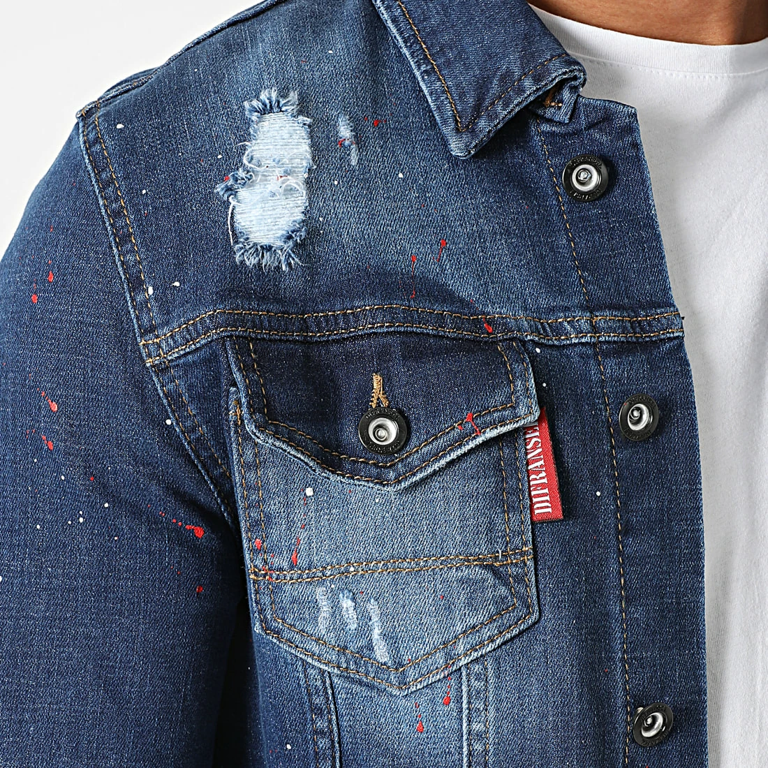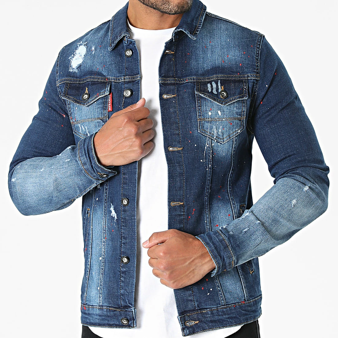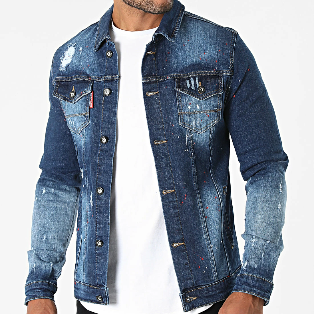 • Veste en jean finition usée, tachée et délavée avec trous apparents